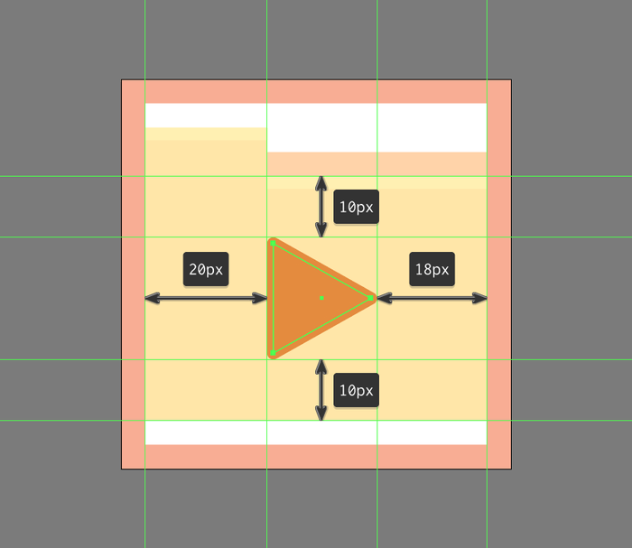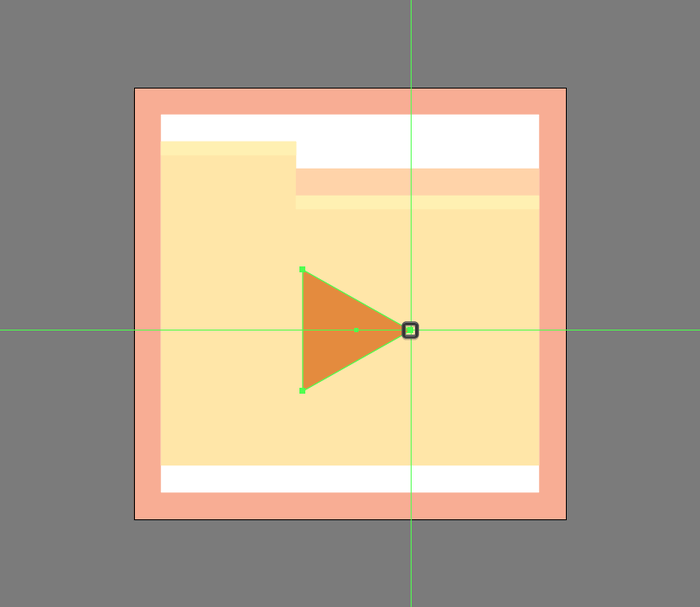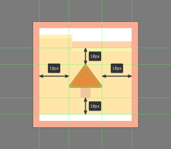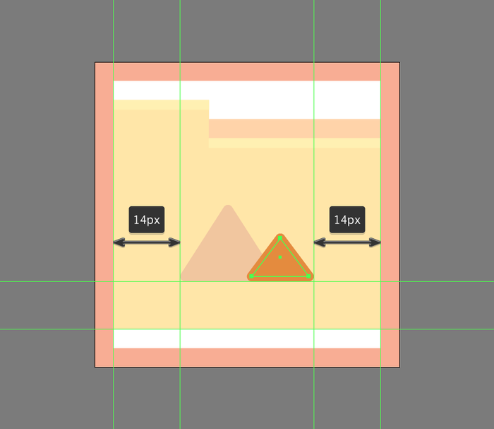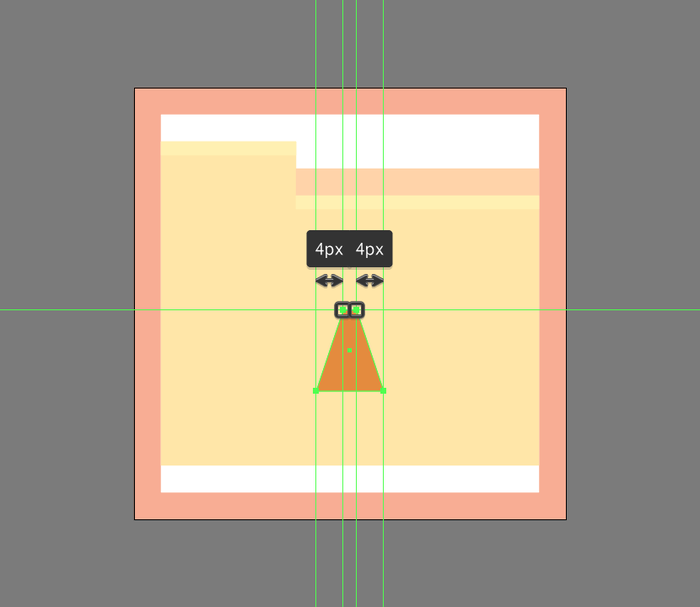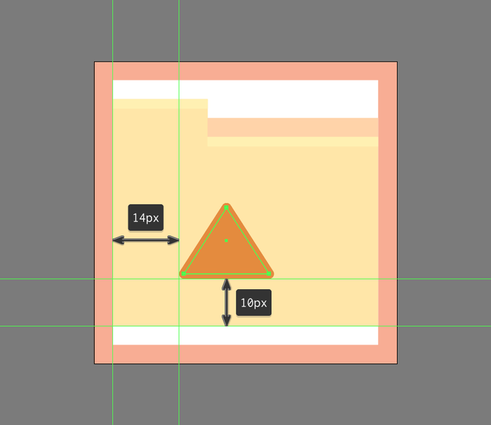 将形状转换为三角形,方法是使用“ 添加锚点工具”(+)在其上边缘的中心添加锚点,使用“ 删除锚点工具”( - )删除其侧边锚点。使用描边创建2 px宽的轮廓(#E58C3C),使用Control-G键盘快捷键选择并将两者组合在一起。