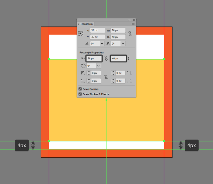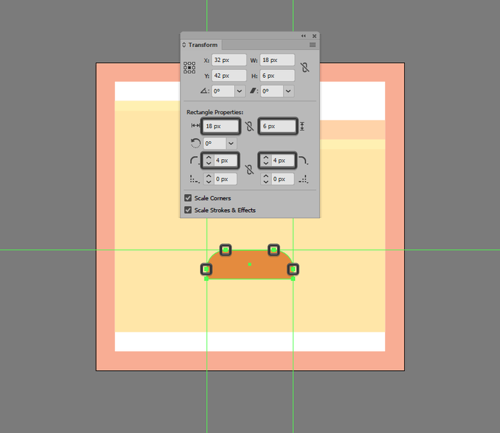 打开“ 变换”面板并在“ 矩形属性”中将其顶角的半径设置为4 px,调整我们刚刚创建的形状。
