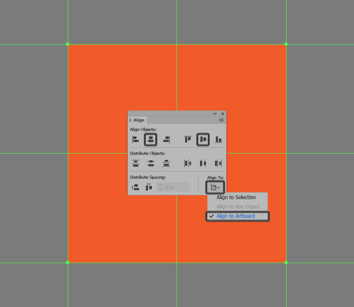 选择矩形工具(M)创建一个64 x 64像素的正方形,使用#F15A24进行着色,然后使用“ 对齐”面板的“ 水平”和“垂直对齐中心 ”选项定位到第一个画板的中心。