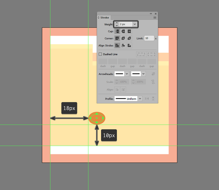 通过使用直接选择工具(A)单独选择其顶部锚点,然后使用方向箭头键将它们推入内部4 px,调整我们刚刚创建的形状。