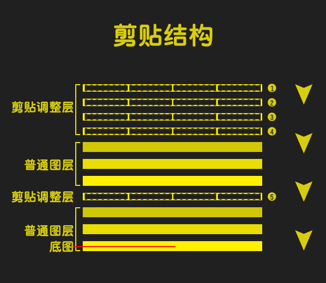好啦,全图级别的限制就是这么简单,那么剪贴蒙版是如何工作的呢,剪贴蒙板的核心就是向下生效,咱们从图例来看一下,图例中一共有5个剪贴的调整层,我给他们打上了相应的编号,每个调整层都只对下面的图层生效,比如5号调整层,他只对最下面的3个图层生效,又比如4号调整层,他对下面的7个图层都能生效,像1号调整层他就可以对这个剪贴结构内的所有图层生效,而剪贴结构的终点就是最下面的底图,你的调整层最多只能辐射到底图为止,这就是剪贴结构的大概阐释了。