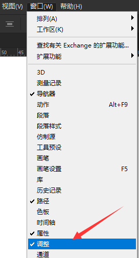 好了,咱们通过这样一个长篇大幅,总算把调整层的6个特性讲清楚了,这6个特性分别是:无损、限制结构、图层化、随时改动参数、不增加体积、混合叠加,与之相比,传统的调整功能就显得捉襟见肘了,在调整层面前显得多么经不起风吹雨打,如果现在还有没用过调整层的小伙伴赶紧打开你的Photoshop试一下这个神奇的模块吧,如果你的Photoshop界面没有调整面板,可以在软件的母菜单中找到【窗口】,在窗口下面就有一个调整了。