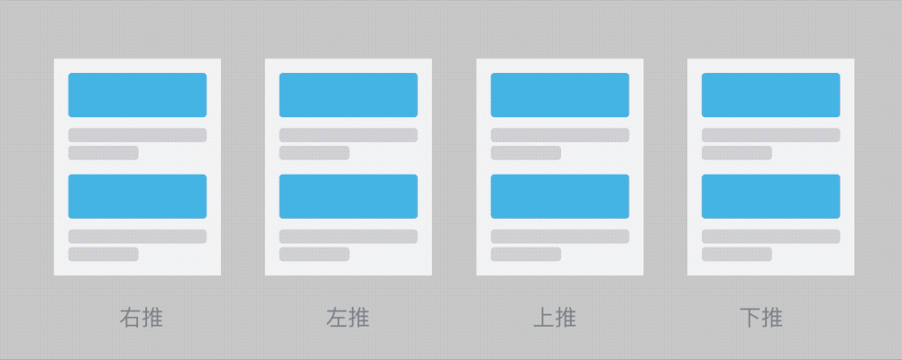 滑动:目标页面可以从上下左右四个方向平移进来,并覆盖到当前页面上方。