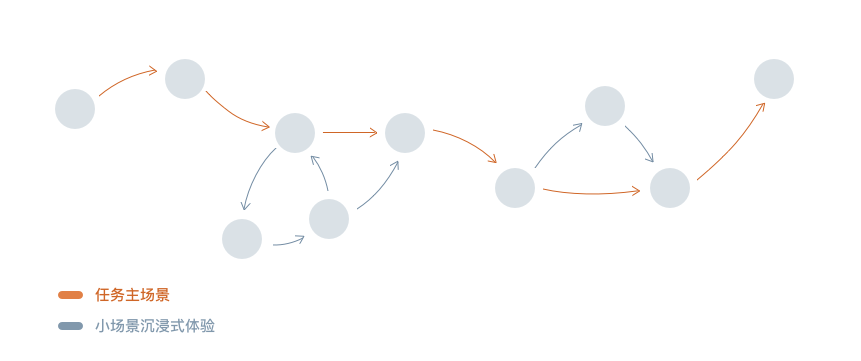 此时可以针对该场景制定一个小的导引系统,营造『小场景沉浸式体验』,在游戏中经常使用该导引设计,示意图如下: