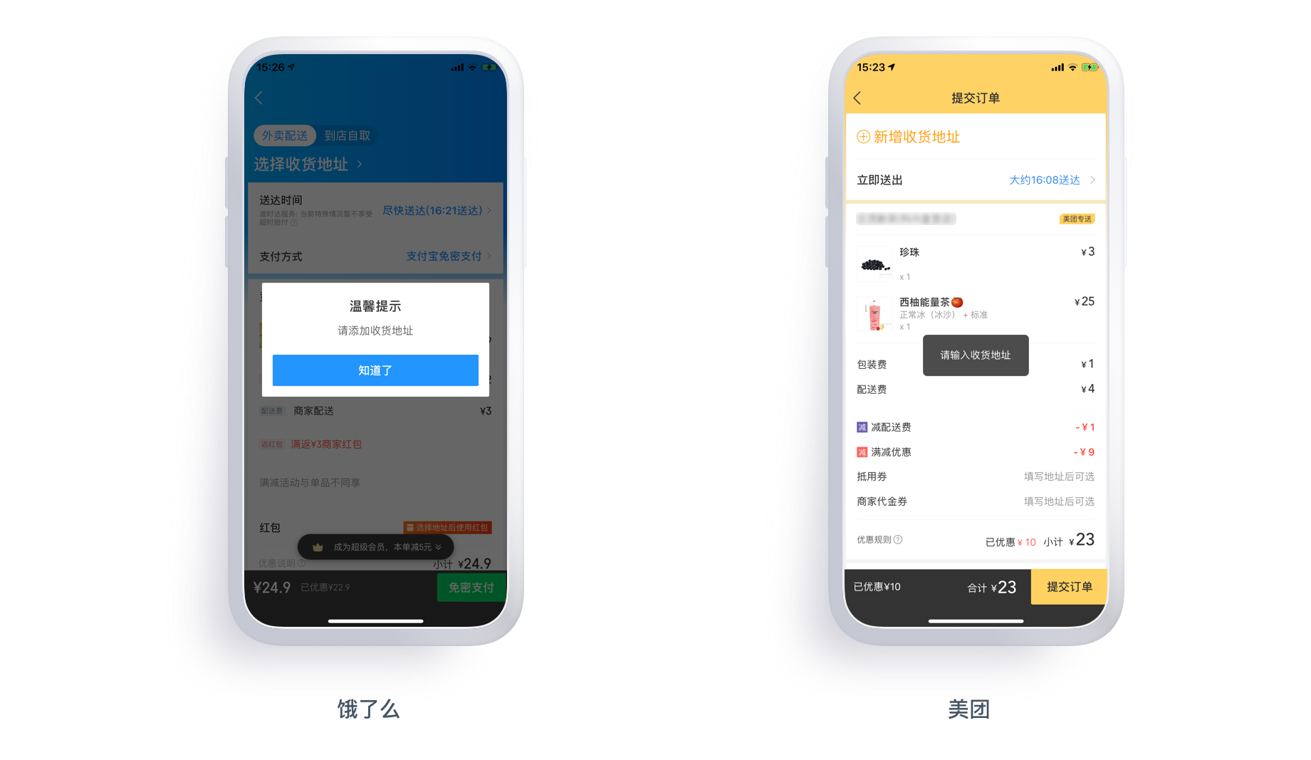 在「饿了么」与「美团」中,当用户未填写收货地址时提交订单,系统做出提示反馈,笔者认为此时应该直接导引(跳转)至收货地址新增/维护界面,节省操作成本。