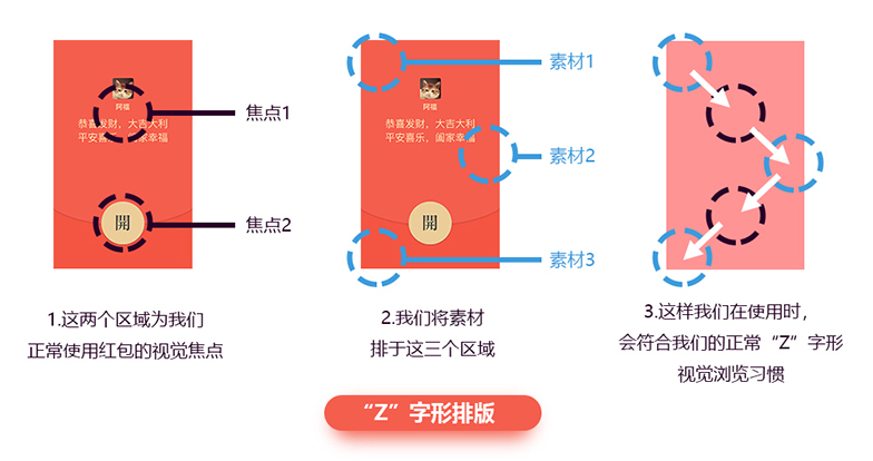 因为上面提到,微信红包界面有固定的元素,我们设计时不能影响基本元素的显示,同时不能喧宾夺主,所以这里推荐2种快速上手的排版方式。
