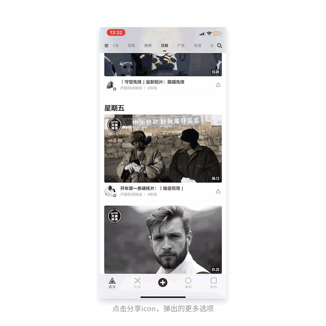 以下是开眼视频feed流中的信息卡片,通过观察我们可以得知,用户仅可以在不点击进入详情的状态下,对其进行分享、收藏以及查看评论。