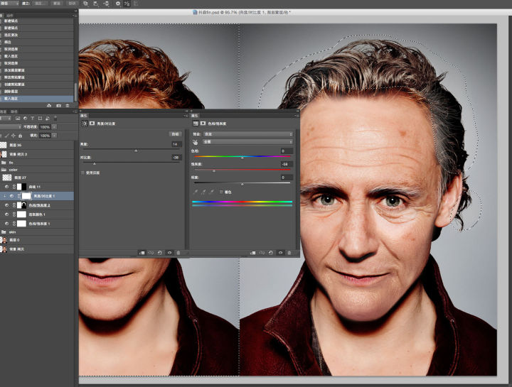 我们用蒙版选定头发范围,然后用色相饱和度工具适当降低发色的饱和度,再用亮度对比度工具适当调整一下: