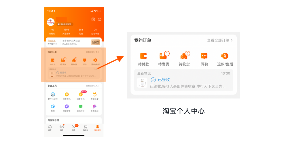 把个人总心中最常用的“我的订单”,放置在较显眼的地方,形成小型的金刚区,为了用户更快的选择,还有物流的显象化设计,把在金刚区中“待收货”中重要的物流信息提取出来,让用户在个人中心页面停留的时间缩短,更多的精力停留在首页和其他的页面。