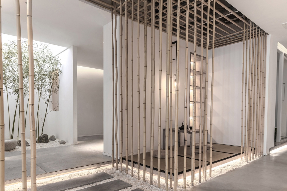 竹子的形态在这个办公室设计里尽情的展示出来,古人爱竹,今人赏竹,常以这种清幽的绿色植物来代表宁静
