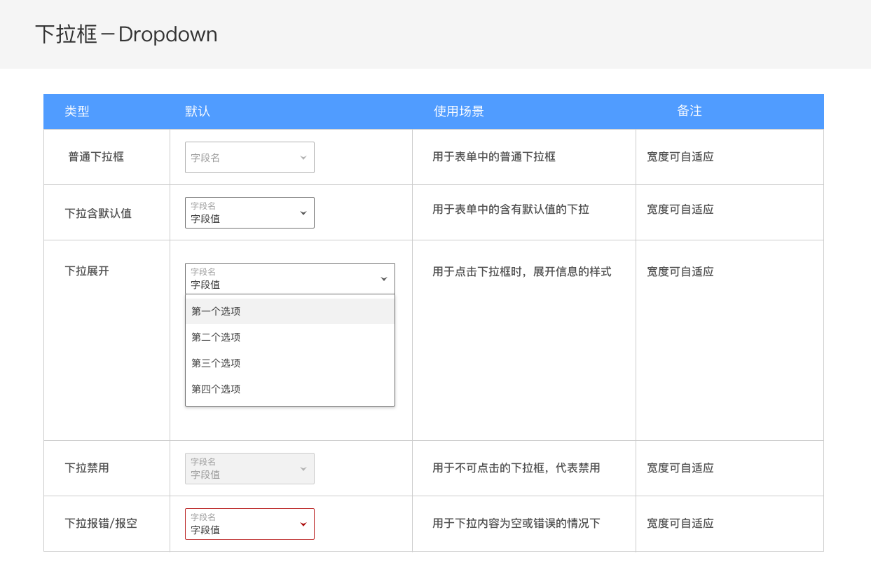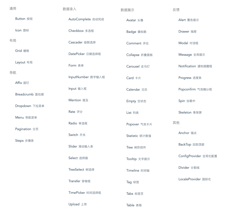 较为全面的组件类型和说明可参考https://ant.design