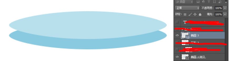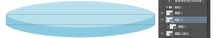 第一步 用椭圆工具画一个椭圆第二步 复制这个椭圆,往下移动大约20-25个像素之间值,换一个同色系深一点的颜色第三步 在这两个椭圆之间,用矩形工具画