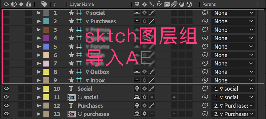 前面说过我平日主要用sketch完成设计稿,因此一款关联AE和sketch 的工具对我来说必然更有效。sketch2AE这款插件很早就有人介绍了,我主要分享自己的一些经验。sketch2AE是sketch和AE的插件,它可以使sketch里的文件通过复制粘贴这样简单的操作相互转化。我在使用过程中开启了AE图层管理的新大门~很早我就想知道如何能在AE里对图层进行分组管理而非预合成。预合成当然有其优秀之处,但是不得不说它在预览总体效果和尺寸调节上并不便捷。principle中创建的分组在AE自动生成一个空对象作为原先组内图层,这样生成的“类组”可直接在当前合成中编辑和预览,而且 创建“类组”不必再去调节它的尺寸(因为空对象并没有尺寸)。