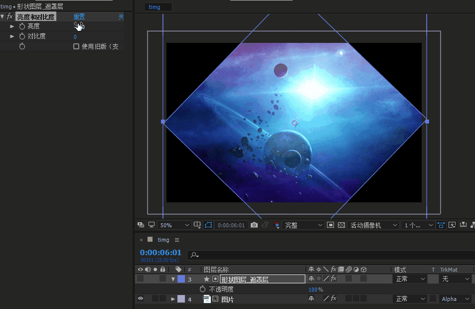 将图像放置到三个形状图层的最顶端,找到轨道遮罩TrkMat旁边的T-保留基础透明度,在图像图层上点击启用,得到如下效果: