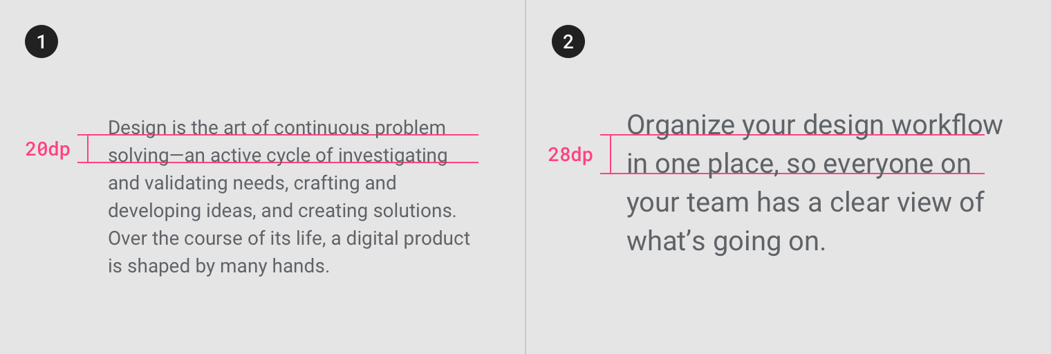 规定UI元素与文字的距离以到基线为标准。基线值与软件无关,所以可在任何设计程序中使用,网格也同样如此。在Android和iOS上,代码可以从基线相关的规格转换成内边距。对于web,可以使用Sass或CSS自动计算。