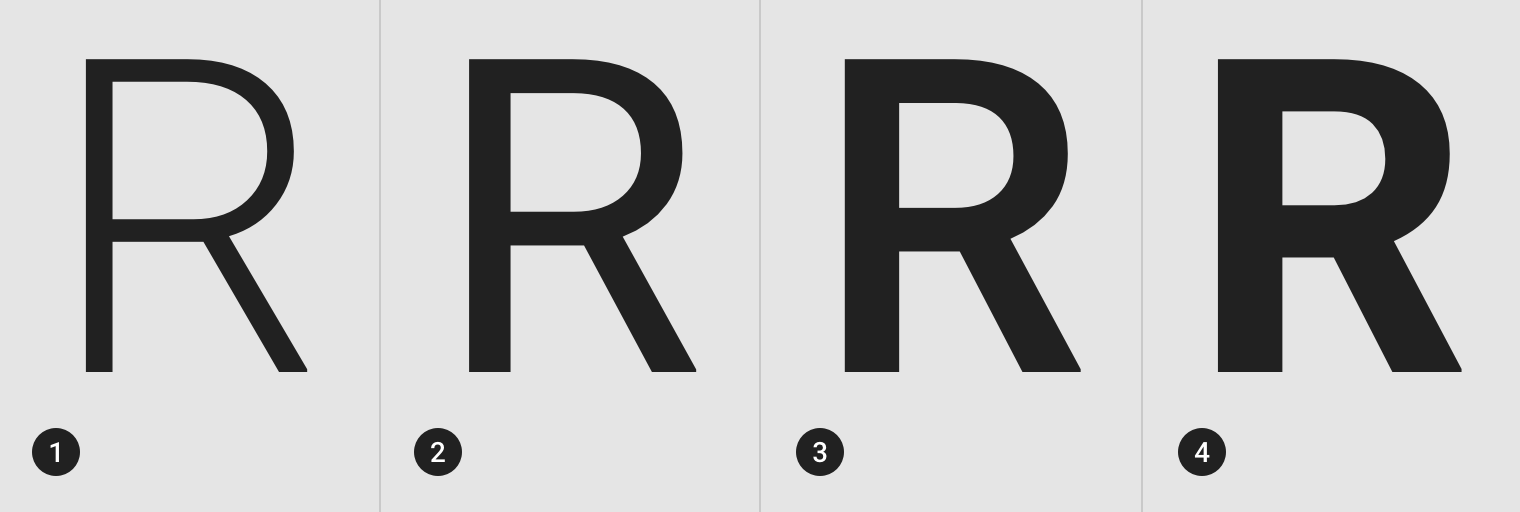 字重指的是字体笔划的相对粗细。一个字体可以有很多个字重,通常情况是4-6个。