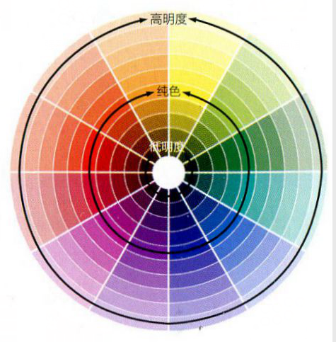 比纯色的颜色浅一点的颜色就是高明度;比纯色要深一些的颜色就是低明度。纯色就相当于一个中间的判断标准。