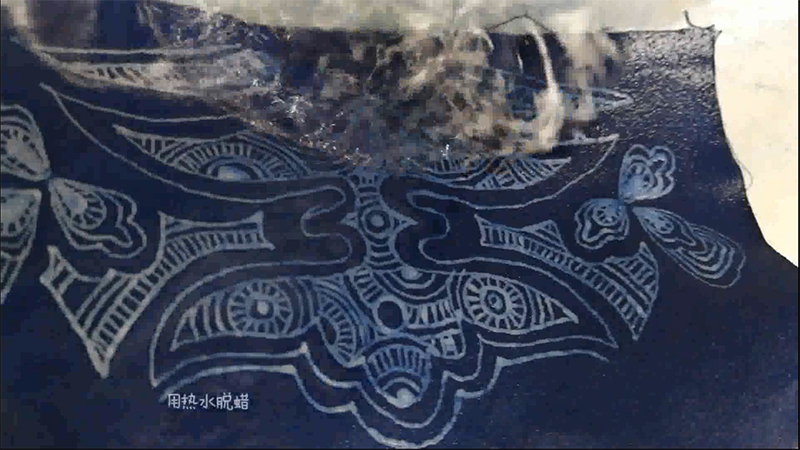 打开传统蜡染染缸,将染液搅拌均匀,放入面料进行侵染(摆动面料能促染,但是动作要轻微,否则会使蜡纹断裂而形成冰纹)