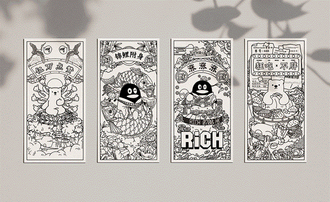 在八套福卡设计中我们选择了人气最高的四款,制作成实体红包。整套红包配色有别于传统红包的大红色,元素丰富,也更符合年轻人的口味。