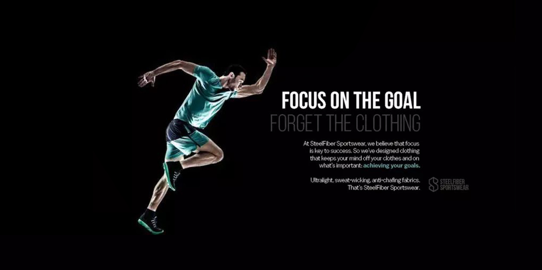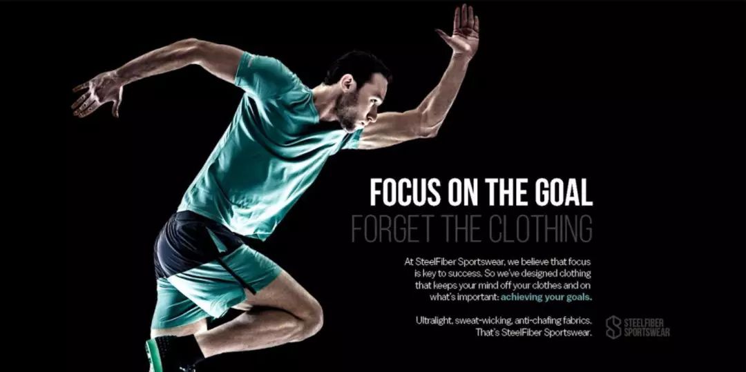 解决办法:放大,放大,再放大,使人物细节展示更突出,力量感得以展现,四肢舒展,动作利落,充满活力。配上激励人心的广告文案,运动服广告感染力十足!