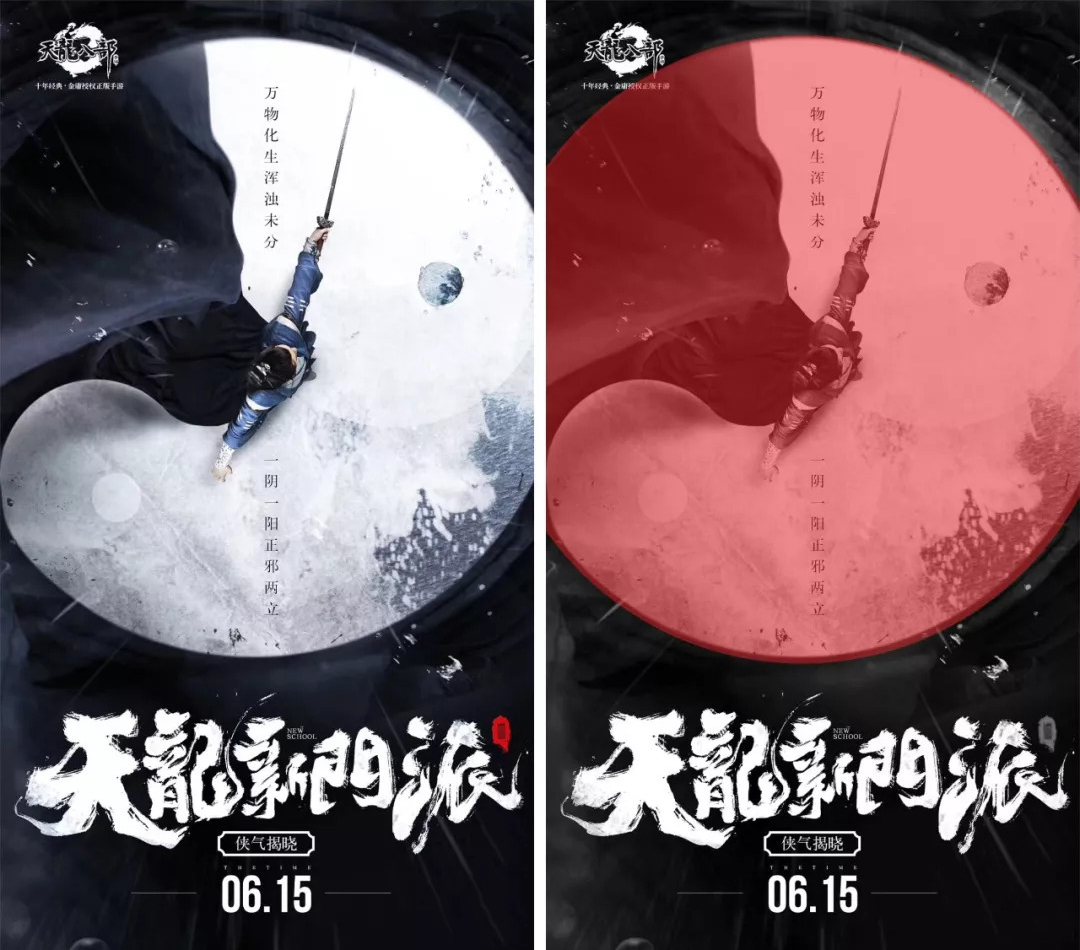 图一海报通过俯视的视角,将人物的披风与周围的场景融合而成一个太极的图案,画面感极强,而且在色彩的运用上基本上也是黑白浑然天成。俯视的视角为画面本身塑造了很好的图与底的形象,视觉印象很深刻,当然视觉焦点也就形成了。