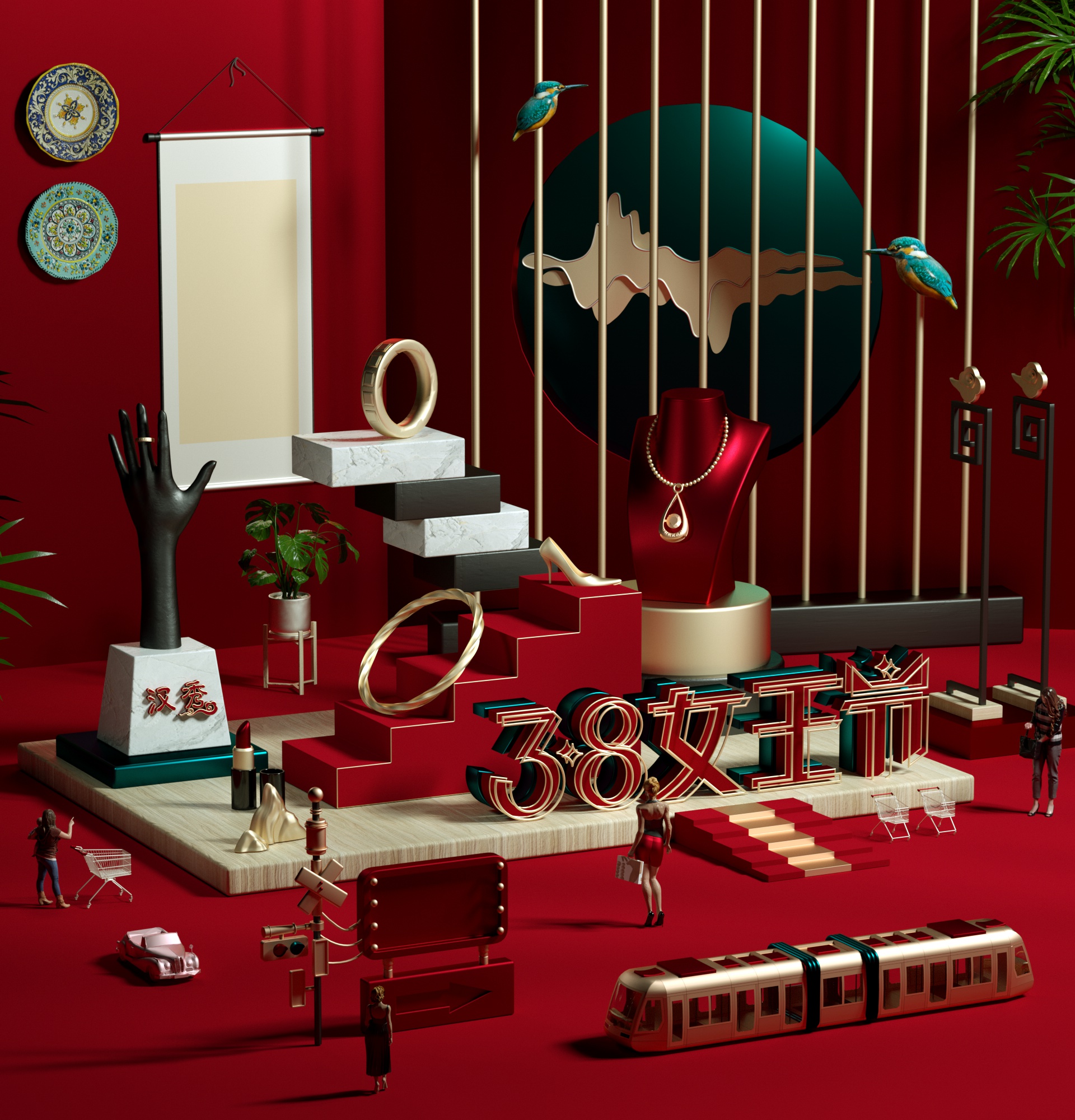 一开始想了很多,过年的氛围,回家送礼,火车,珠宝城购物,这些关键词来进行提炼,视觉元素,很多公司的设计应该都有头脑风暴,这是一个很有趣味的一个思考和创意迸发的一个游戏环节,比你自己一个人去冥思苦想有的时候效率会高很多。紧接着就是落地执行了,在这里有一个小窍门,那就是很多时候这种活动页面元素很多的时候,并不是所有的有需要自己去建模,在这里我也分享几个可以下载的模型网站,大家可以去了解下,因为很多模型拿过来直接用,再去组合你的画面,会节约大量的时间,不然你很难去一个人执行完成,因为很多中小公司,都是一个设计打天下嘛,什么建模渲染,排版,上线等等,因为小白设计师我就是这样的苦逼。