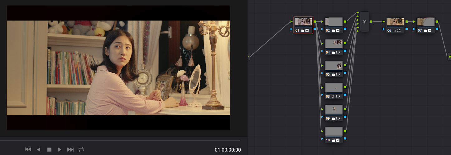 这个电影的素材全部由ALEXA Mini拍摄,同时演员的形象、化妆及照明效果已经很好了,所以根本不用去想什么美颜。而需要考虑的则是,如何通过调光来体现环境氛围以及人物情绪等更深一层次的视觉映像。