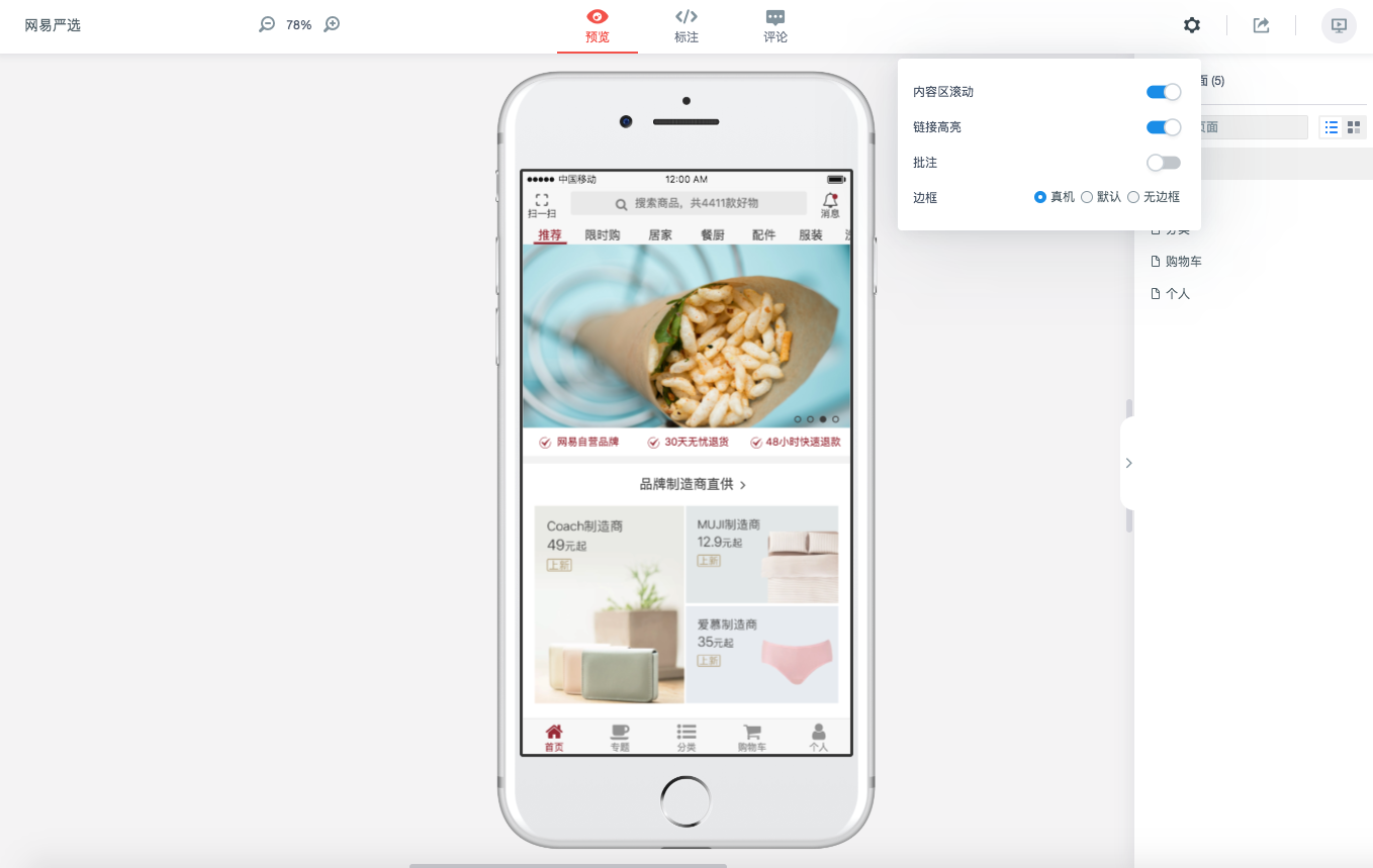 在“预览“页面,你还可以设置原型是否带真机外壳,链接区域是否高亮,是否显示批注,内容区是否滚动。