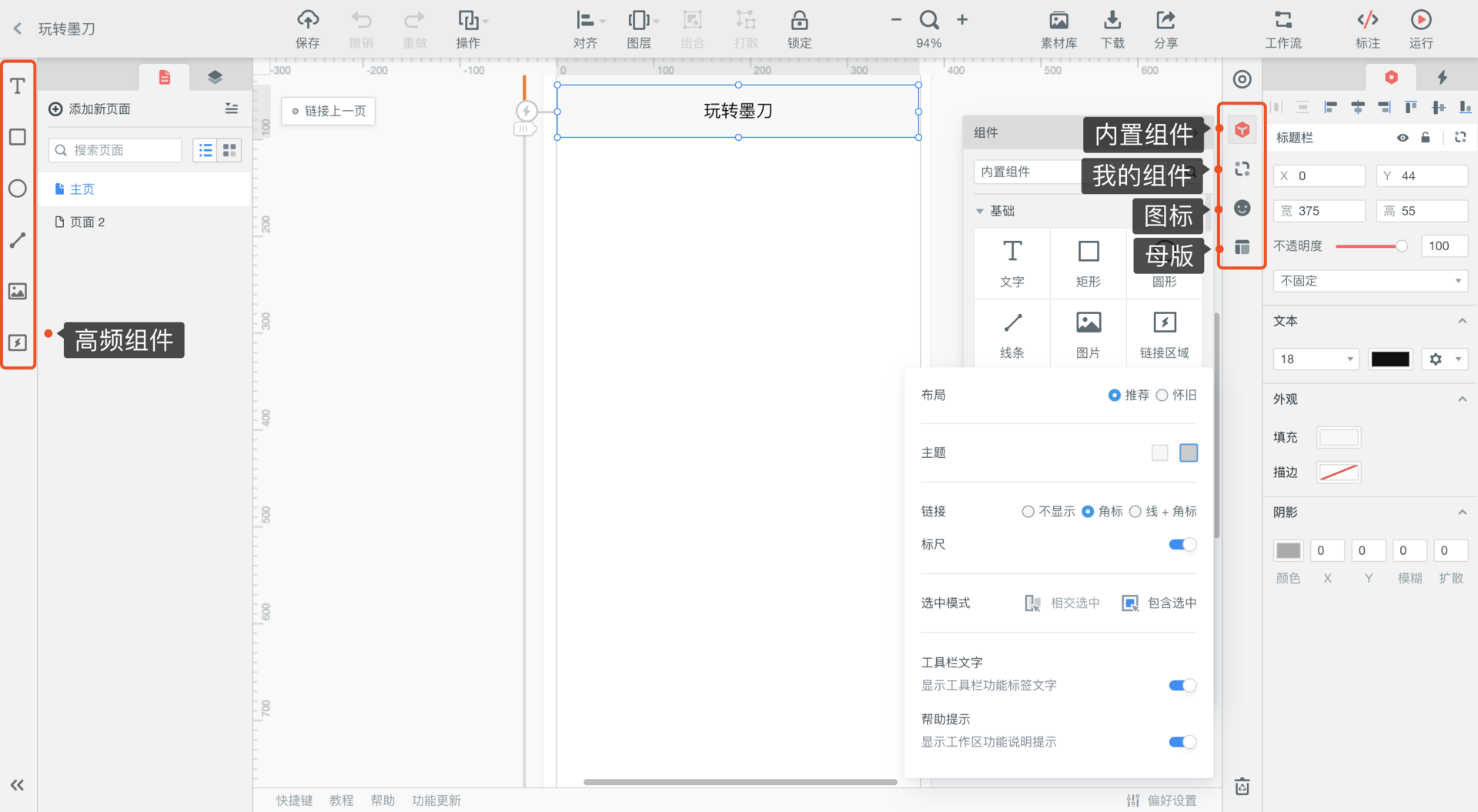 右侧组件区:包括墨刀内置的组件、我的组件(你可以将高复用的组件添加到这里)、图标、母版(有继承性,一改全改)