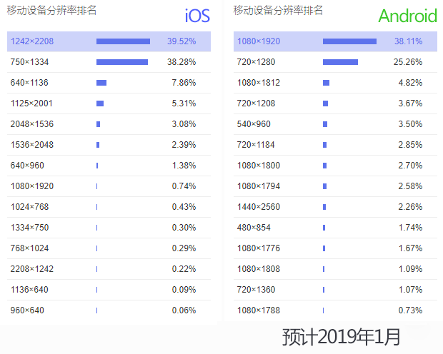 从市场数据看分辨率使用情况(预计2019年iOS使用分辨率1242超过750):