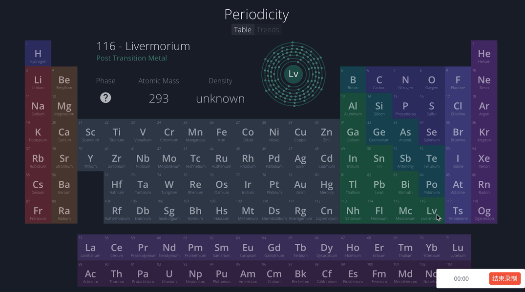 元素周期表。鼠标放在不同的元素上,会显示对应数据的变化。