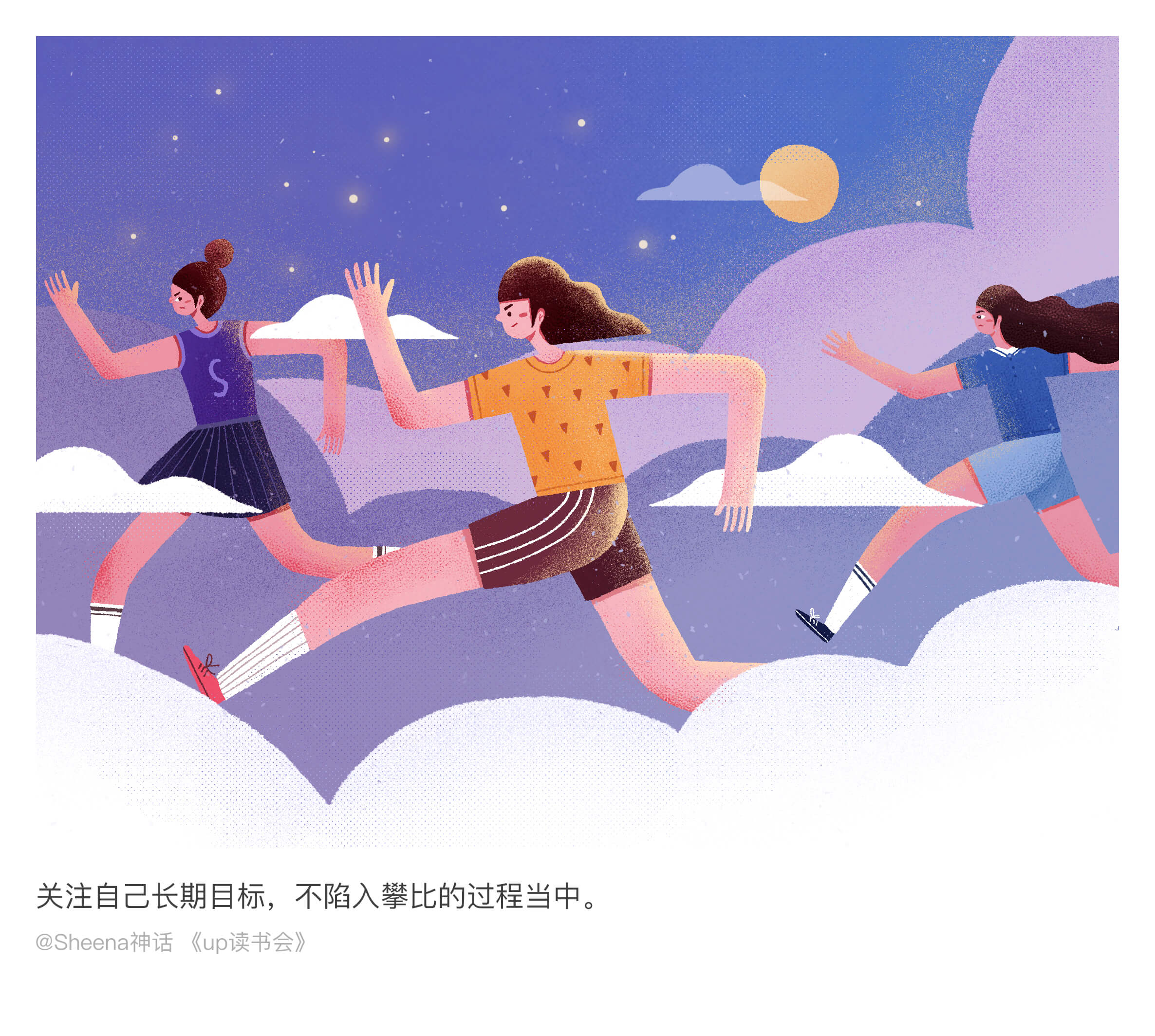 闯关计划最后十天是给文字配图。这一阶段,想把难度再提升一点。从创意,构思,想构图,到人物设计和色彩搭配,每一过程都经过精心的考量。就想出把读书会当中最美的文字表述成画面这样一个形式。是最艰难的一个阶段,因为你需要去思考用什么方式去表达这样一个文字,为了可以画到一个效果,找很多类似参考去研究,并而达到自己满意的状态。