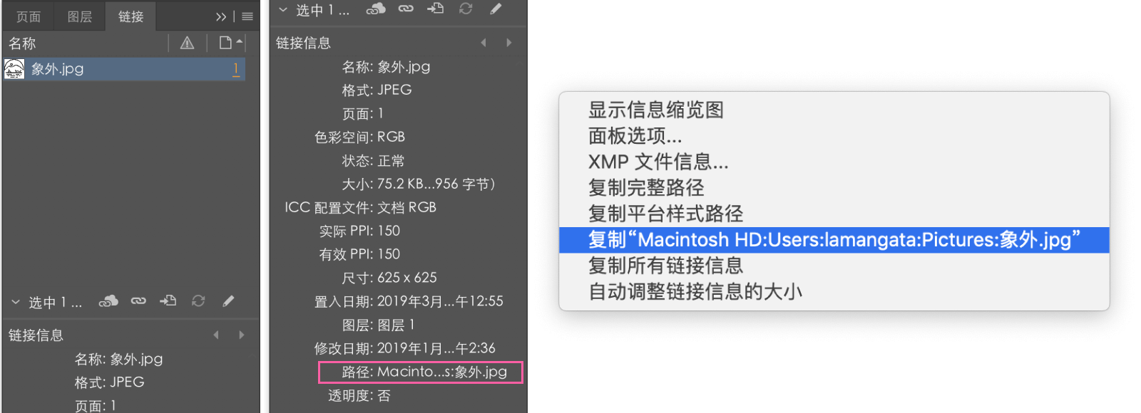 可以把图片置入 InDesign 里,点击图片,在「链接信息」里复制图片路径。