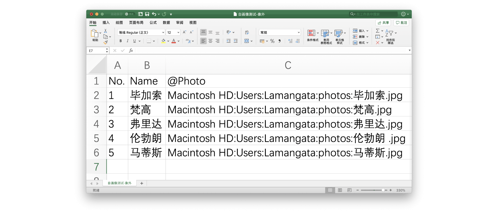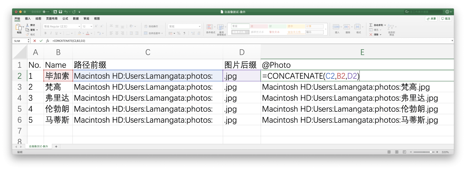 通过「合并函数」,我们可以控制定量和变量,实现半自动化。图片的命名还是需要自己命名的!比如在这里,「Name」是变量,「图片路径前缀」和「图片格式后缀」是定量,那么我们只需要通过 CONCATENATE 函数告诉 Excel 怎么操作,Excel 就会根据公式写出我们需要的图片路径。