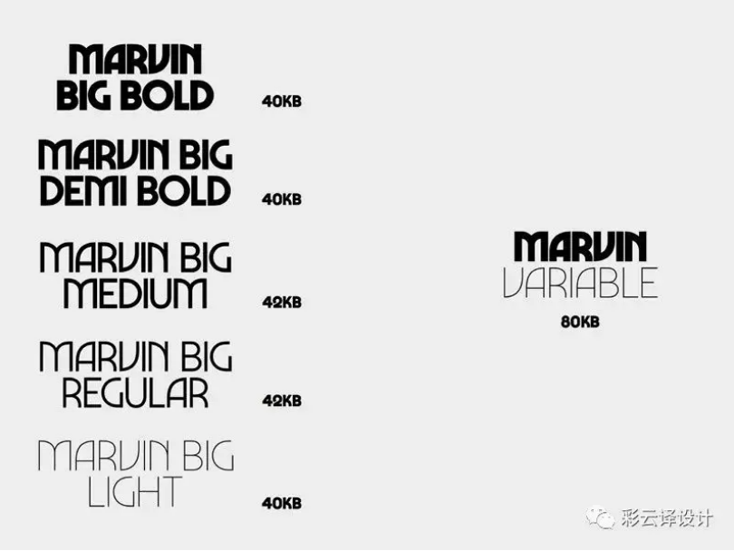 当设计师设计多种字体时,需要尽量为用户提供所有字体文件,确保用户能够在使用时能够看到不同粗细,实现很好的版式效果。但对于可变字体,你只需要提供一个文件,就可以实现字体的多种变化,为设计师的设计效果提供了更多的可能性。