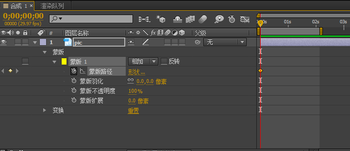 2、展开蒙版选项,这次我们调整蒙版路径参数;在时间轴开始的位置添加一个关键帧;