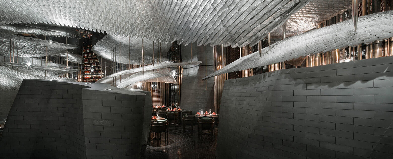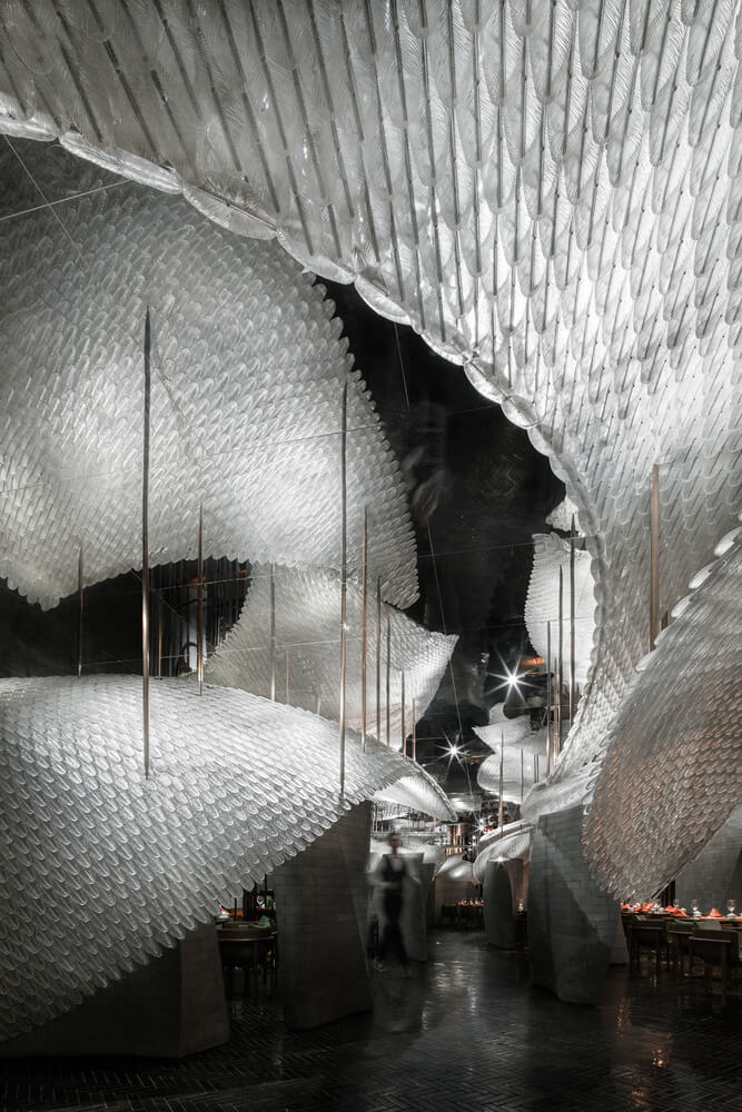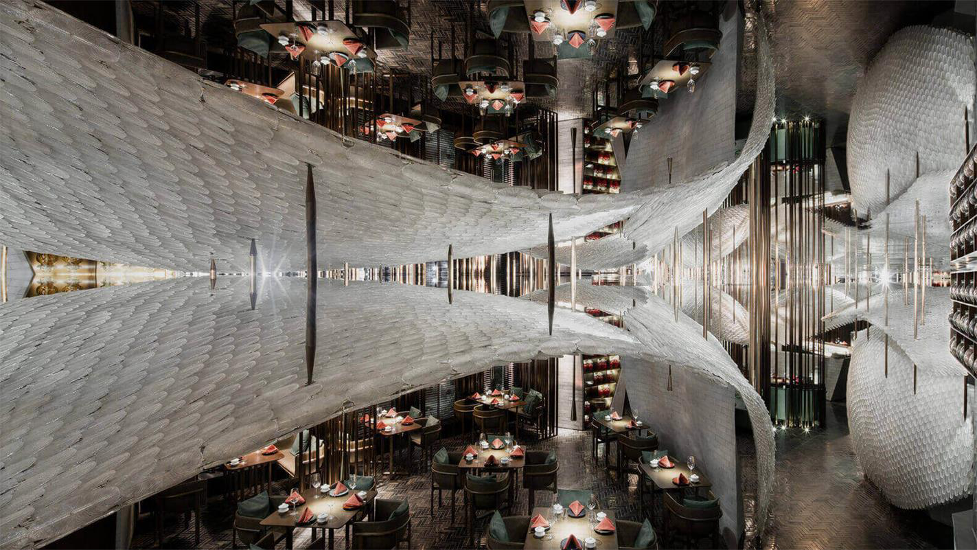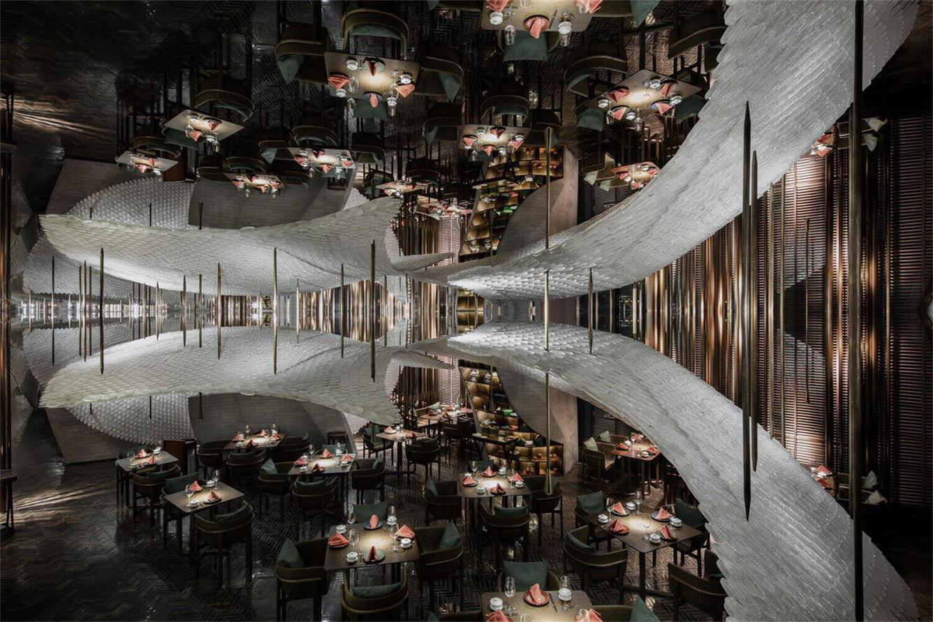 宋•川菜用现代的材料与设计手法来演绎的中式餐厅,十万块异形的不锈钢砖与四十万块琉璃羽毛构成宋餐厅的基本形态。曲面的形态打破了一贯的中式餐厅的想象,形成独特的空间体验。