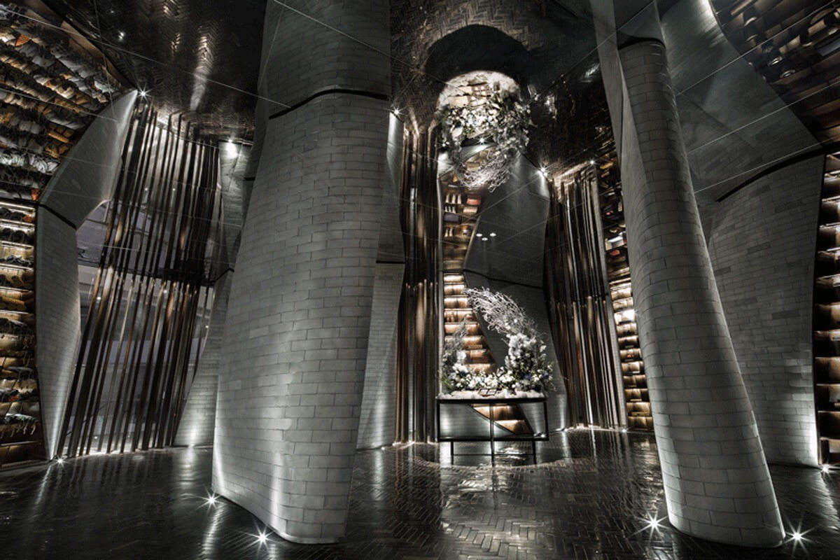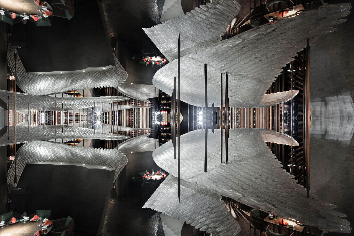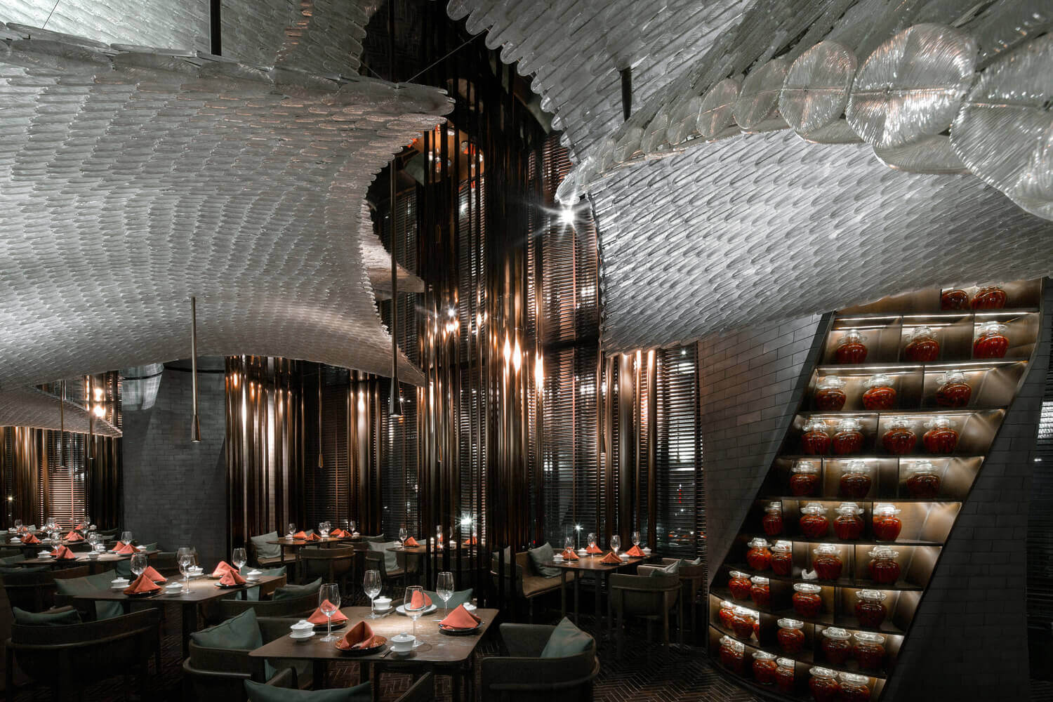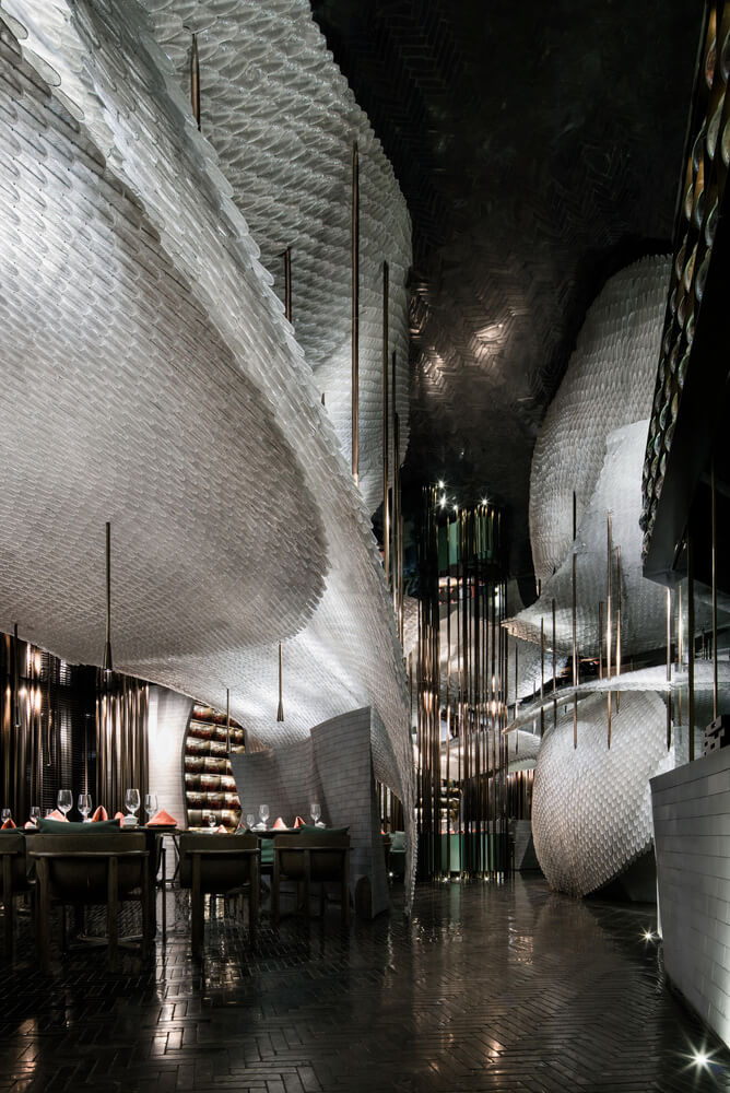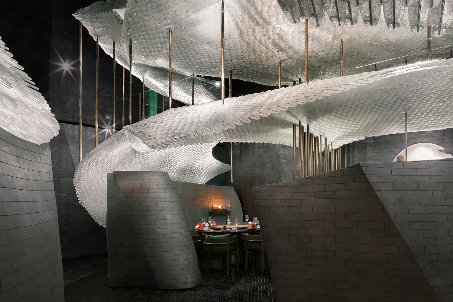 宋•川菜用现代的材料与设计手法来演绎的中式餐厅,十万块异形的不锈钢砖与四十万块琉璃羽毛构成宋餐厅的基本形态。曲面的形态打破了一贯的中式餐厅的想象,形成独特的空间体验。