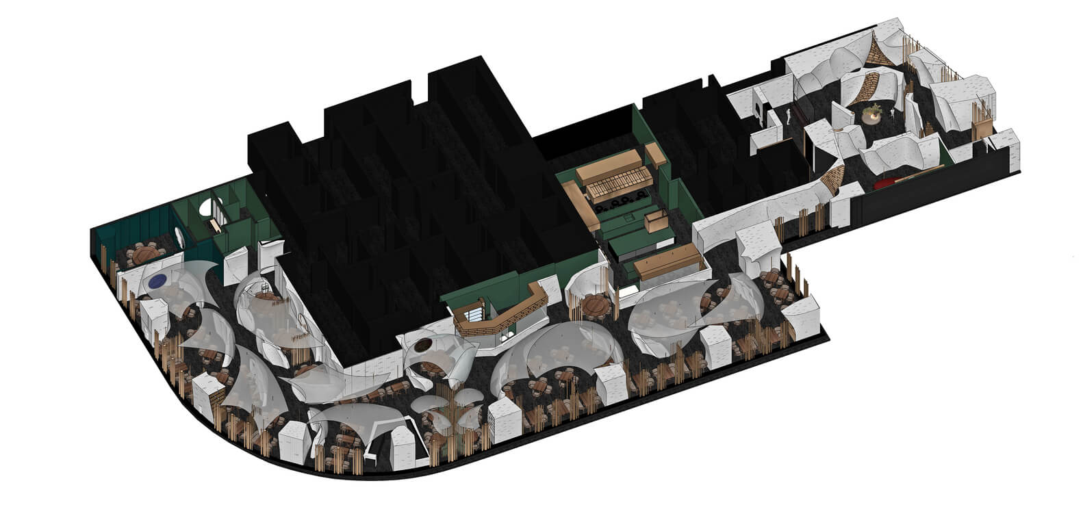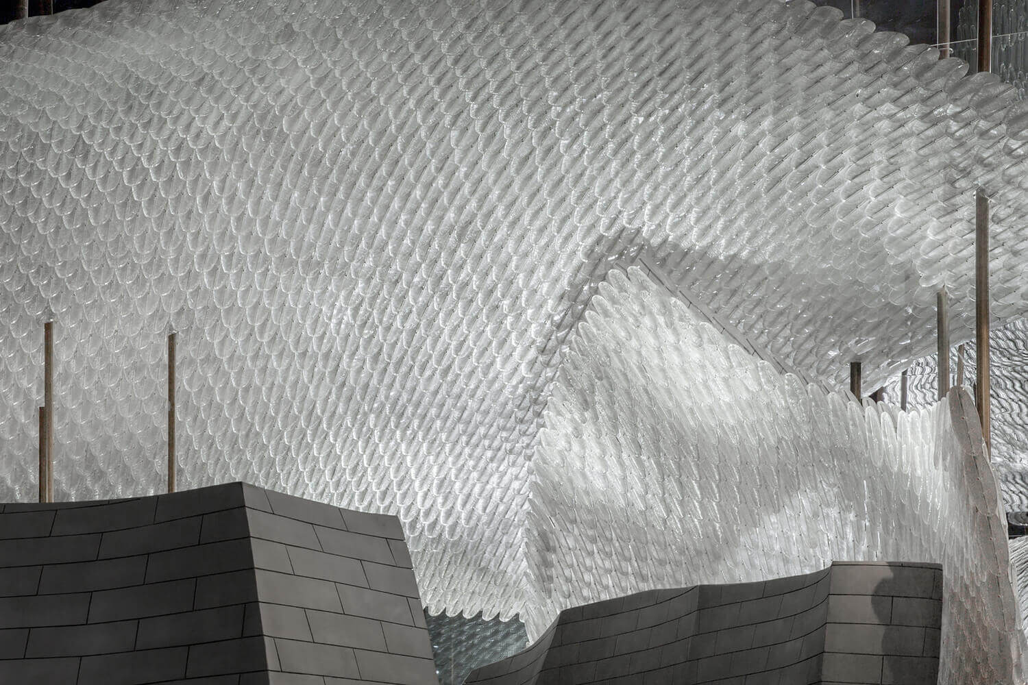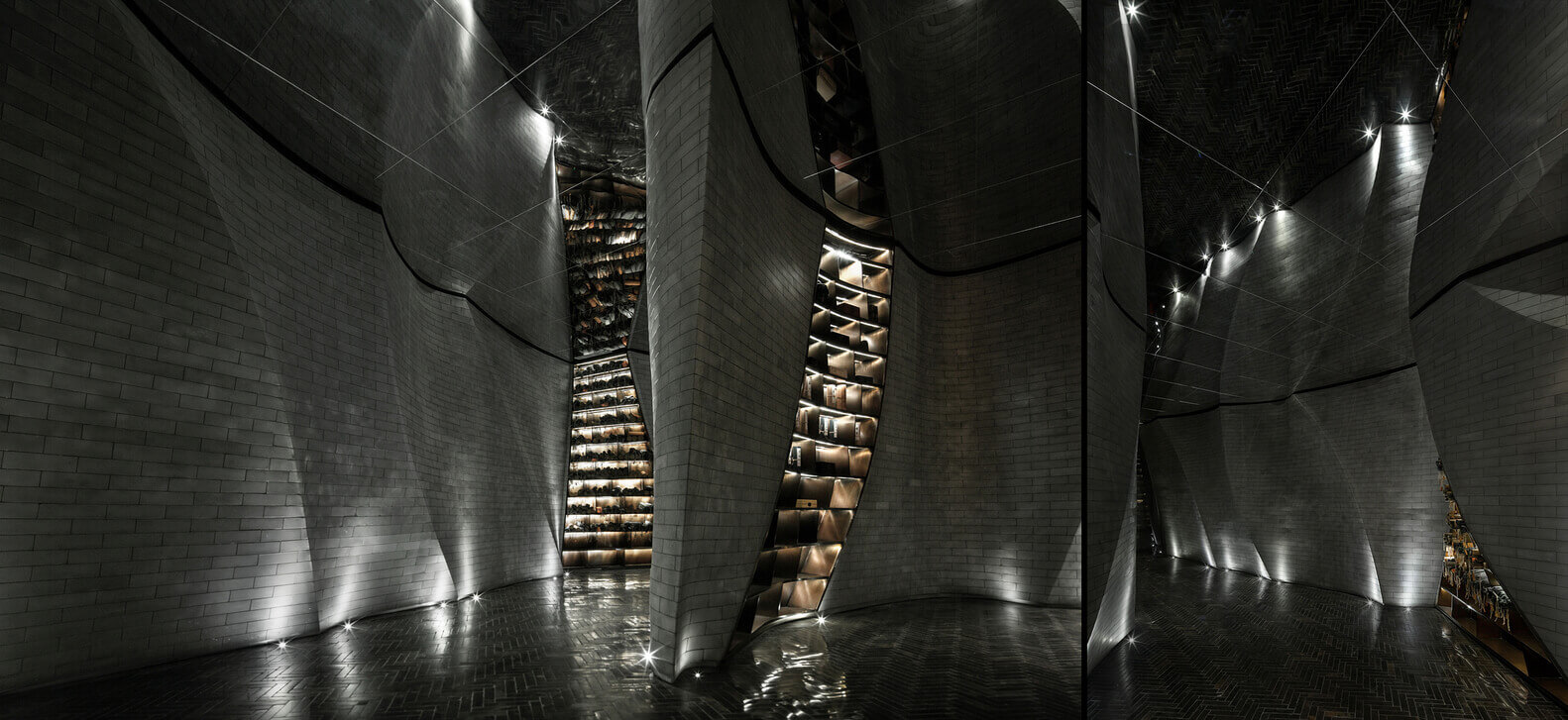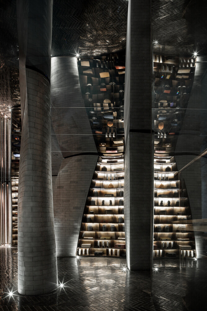 宋•川菜用现代的材料与设计手法来演绎的中式餐厅,十万块异形的不锈钢砖与四十万块琉璃羽毛构成宋餐厅的基本形态。曲面的形态打破了一贯的中式餐厅的想象,形成独特的空间体验。