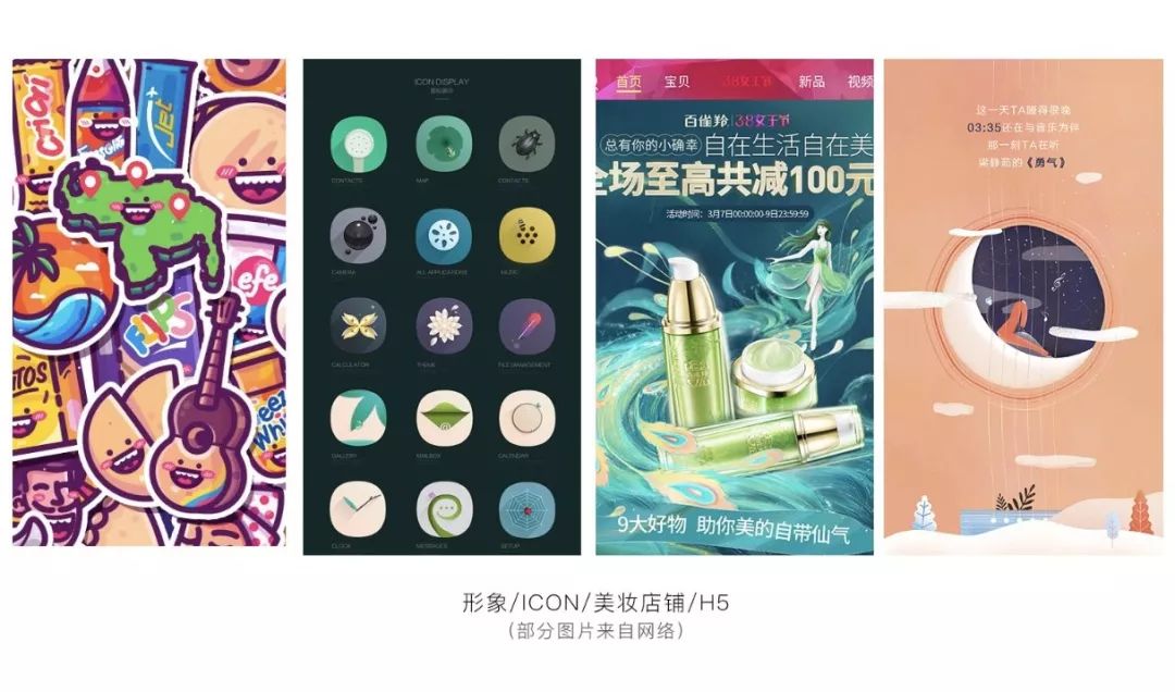 我大致将插画分为线上和线下两类。线下插画主要是绘本/广告/刊物/包装等印刷类。多少人曾经因为农夫山泉好看的包装买了那瓶有点贵的水。而本文我们重点说一下线上的插画,主要有以下应用场景:
