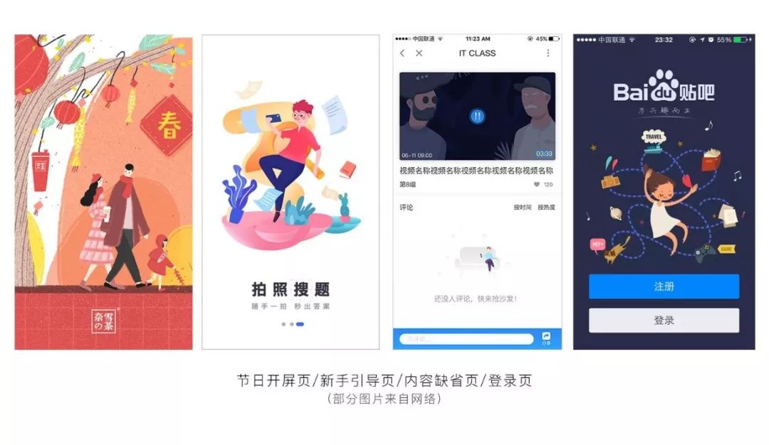 APP闪屏页、节日开屏页、新手引导页面、内容缺省页面、WEB登录页。