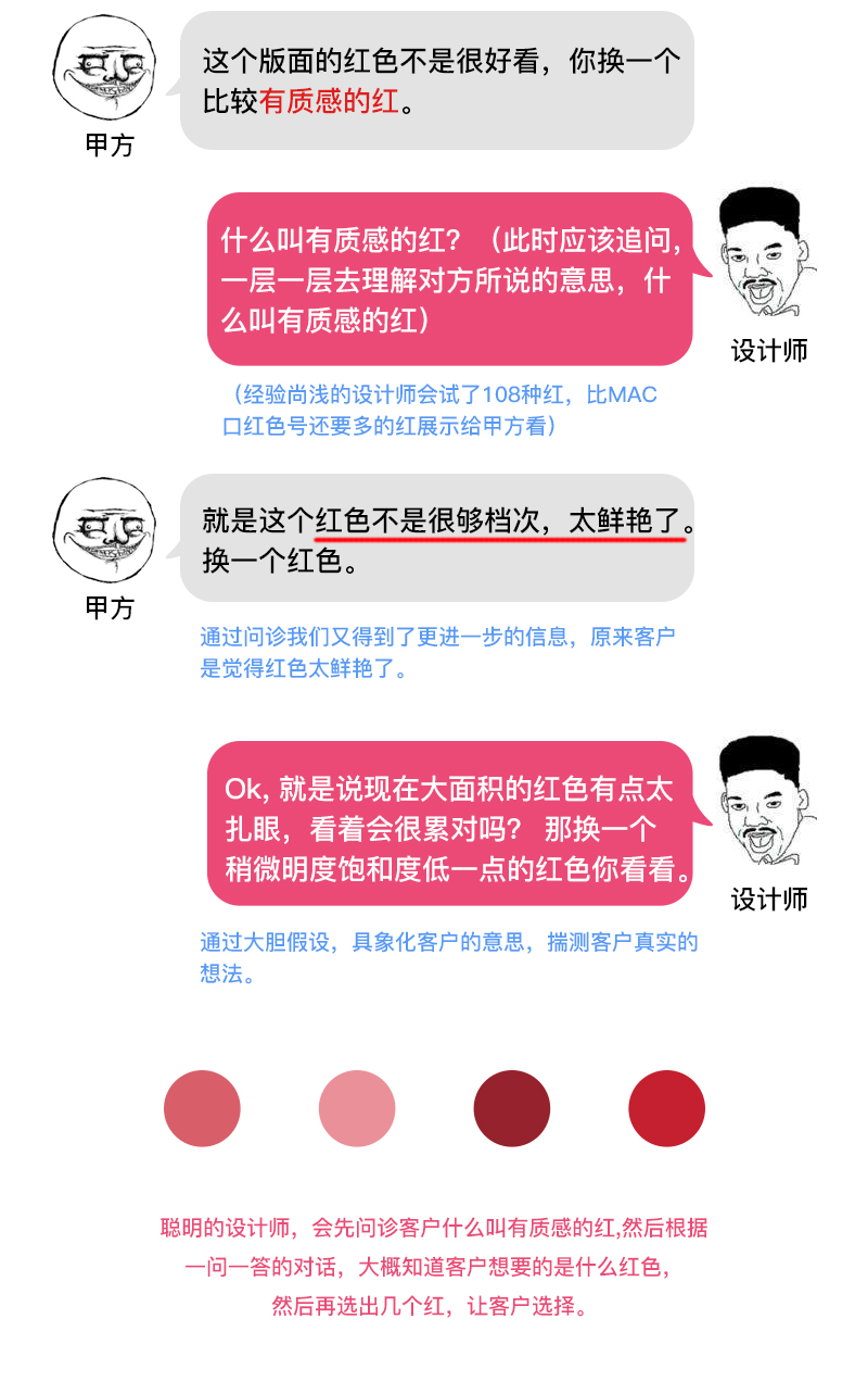 我们需要了解的是客户内心的诉求,从客户表达的意思里头寻找突破口,寻找思路。在面对不专业的甲方时候,甚至很多时候还需要揣测对方的意图。摆好自己的心态吧,我们日常面对的大部分甲方,都是不专业的。请看下方的一个常见对话。