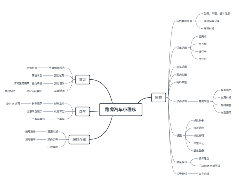 我事先做好充足的准备,我整理清晰我自己的思路,查阅了汽车行业的现状,行业痛点,和目前的汽车小程序的优缺点,画了思维导图和交互图,结合目前行业的痛点列出自己设计方案的可行性以及便利性,更为深入的是我连客户准备提问什么样的问题我都想好了答案。而这一切,就是我自以为的掌握全局,在没有跟客户接触和沟通的情况下。我料定客户必定会被我的完美方案所打动,会钦佩我的谈吐和折服于我的专业能力,会全程被我牵着思路走,会认同我的观点“传统4S需要新的流量渠道注入,结合小程序的线上优势才能扩大自己的流量势能,增加销量。”