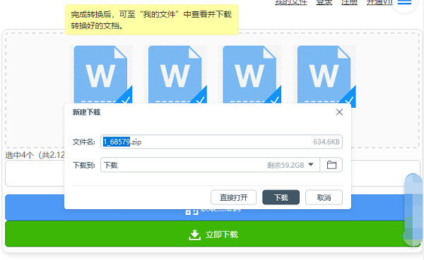 当压缩操作完成后,鼠标点击页面内右下角的【立即下载】,把压缩的Word文件保存到电脑中。