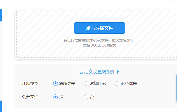 进入新页面后,鼠标单击页面内的【点击选择文件】,将要进行压缩的Word文件添加到页面中;