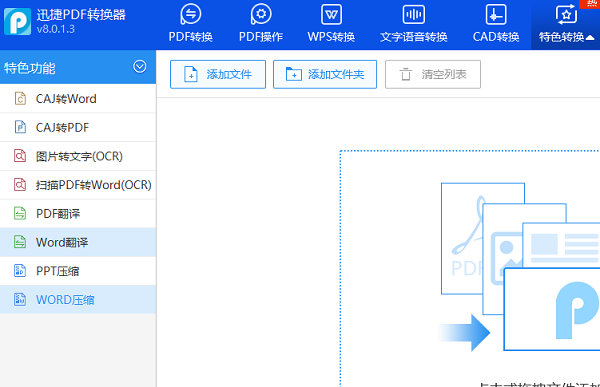 将PDF转换器打开,用鼠标点击界面上面的特色转换,在特色转换中,用鼠标点击界面中的Word压缩功能;