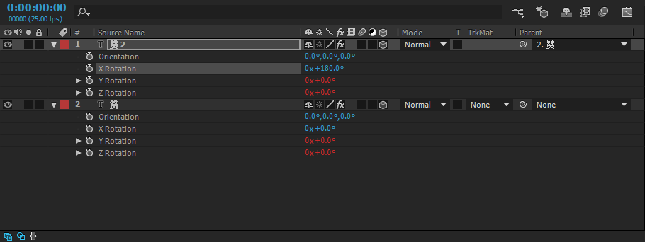 新建两个文字层,然后选中他们,点击magic按钮,然后建立父子链接,将上一层的弹簧绑定到下一层上,然后调整下一层的旋转属性,就完工了,图文操作如下: