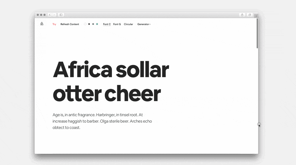 一个基本的静态网站生成器被用来作为我们使用的内容生成网站的承载。它本身也充当了一个测测试员。在这个网站上切换 Circular 字体和新的字体是很容易的,同样还可以切换颜色和字体大小。它还简化了分享进程的过程,并在新的迭代到来时快速的测试。