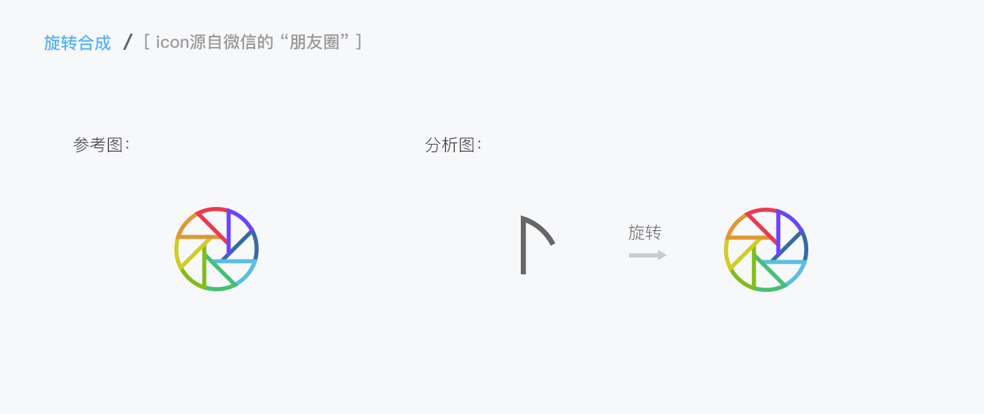 讲解:图标是由其中的一个结构通过旋转复制出来的。如朋友圈的图标是由里面的一块通过中心旋转8份得到。这种设计方法可以创造很多有趣的图形。