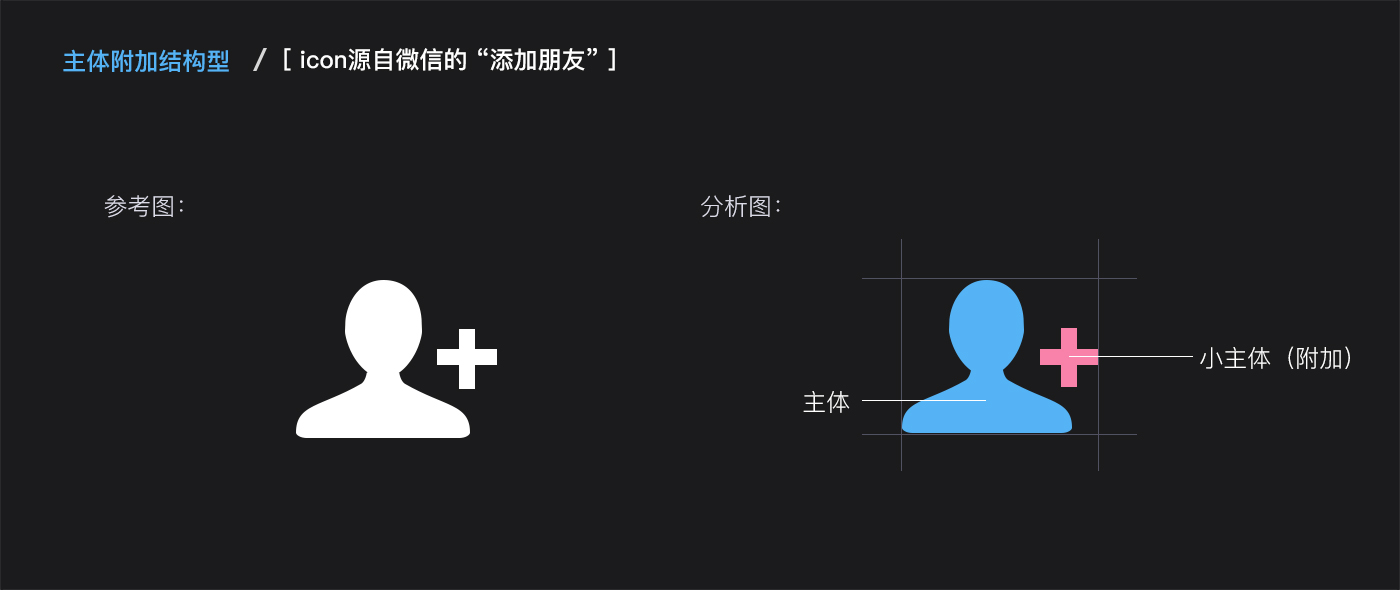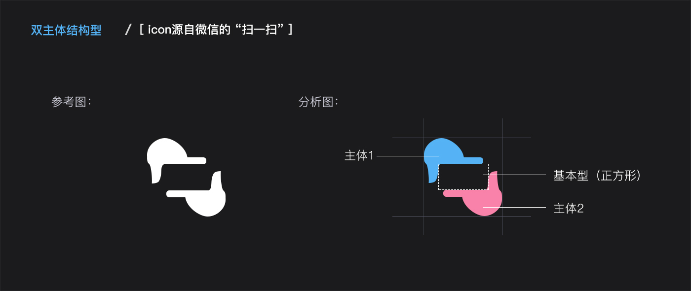 讲解:图标存有两个主体,可以是镜像,也可以是两个不一样的主体互相搭配成一个整体。像扫一扫这个图标用了45度的镜像,让两个手指间形成了一个基本型(正方形),灵感来源于生活中的手型相机。